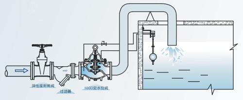 定水位阀是一种隔膜式调节水箱和水塔掖面高度的阀门。阀门由浮球控制,当液面达到设定高度时阀门通过相关结构将信号传递个水泵,水泵停止供水;当液面底于设定位置时水泵自动供水。该阀动作平稳,有效防止开泵水锤和停泵水锤的产生。避免管道产生过高的压力。适用于水箱、水塔的自动供水系统